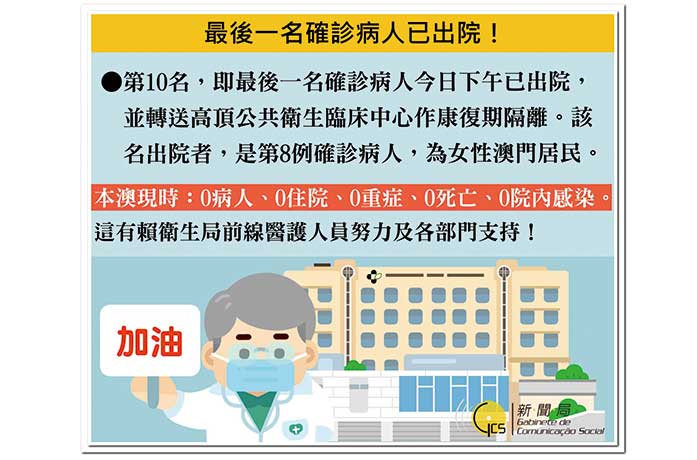 在昨午的新型冠狀病毒感染應變協調中心例行記者會,衛生局局長李展潤宣佈,本澳最後一位留院患者 (第八例確診病例) 於昨午出院,即本澳累計十名確診患者全部已康復出院。他表示,現時澳門零病人、零重症、零死亡、零院內感染個案,此成績有賴衛生局全體前線人員的努力及各部門人員的支持。