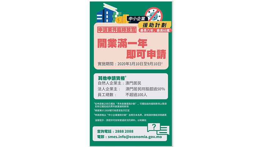 【特訊】根據第4/2020號行政法規及第57/2020號行政長官批示,營業已滿一年且符合其他資格的中小企業自今日起的六個月內,可向經濟局提出「中小企業援助計劃」的申請,即實施期為2020年3月10日至9月10日。