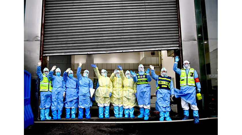 3月9日,隨著最後34名患者離開武漢國際會展中心,武漢市開放床位、累計收治及出院人數最多的江漢方艙醫院宣佈『休艙』。圖為方艙醫院的醫護人員向治癒患者揮手告別。(中新社圖片/安源 攝)