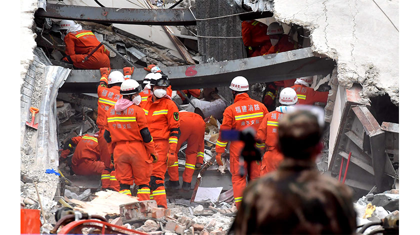 3月9日13時49分,泉州市鯉城區欣佳酒店坍塌事故搜救現場,搜救人員救出該事故中發現的第50名被困人員。截至當日14時,泉州一酒店坍塌事故現場搜救出受困人員50人,其中死亡11人,仍在搜救21人。3月7日晚,福建省泉州市鯉城區欣佳酒店發生坍塌事故,當時造成71人被困(不含自救逃生的9人)。(中新社圖片/張斌 攝)