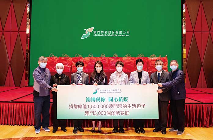 澳博通過澳門工會聯合總會、澳門街坊會聯合總會、澳門婦女聯合總會、澳門明愛、澳門特殊奧運會,以及澳門聽障人士協進會,向三千個受疫情影響的弱勢家庭送贈「愛心生活包」,當中包括單親家庭、長期病患者、獨居長者、殘障人士等。