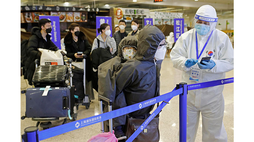 3月13日,上海各區的工作人員在浦東機場T1航站樓對入境旅客進行信息核查。在當日舉行的上海新冠肺炎疫情防控新聞發佈會上,浦東機場安檢護衛保障部旅檢二科科長武戈介紹了浦東機場入境防輸入的閉環工作流程:為進一步防控境外輸入疫情風險,從3月13日零時起,所有中外人員,凡是在進入上海之日前14天內,有過韓國、意大利、伊朗、日本、法國、西班牙、德國、美國等國家旅行或居住史的,一律實施居家或集中隔離健康觀察,也就是一律隔離14天。(中新社圖片/殷立勤 攝)
