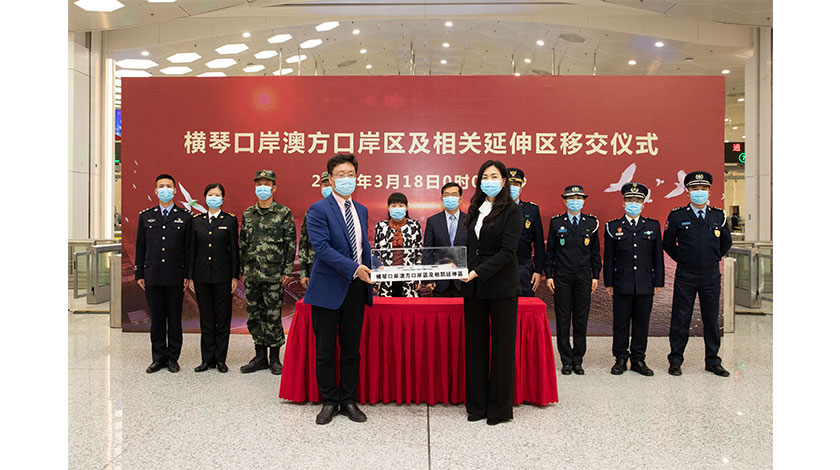 為此,澳珠兩地政府於2020年3月18日零時在橫琴新口岸旅檢大廳一樓舉行橫琴口岸澳方口岸區移交儀式。儀式上,珠海市台港澳工作辦公室主任鄒樺宣讀了國務院有關批覆,隨後橫琴新區管委會副主任吳創偉將橫琴口岸澳方口岸區象徵物(橫琴口岸澳方口岸區模型)交予澳門保安部隊事務局局長郭鳳美。
