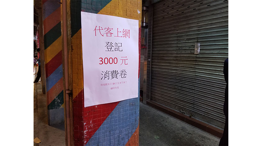 局方人員到場時發現懷疑的相關商舖已經關門,而店舖門外張貼了「代客上網登記3000元消費卷」字樣的標貼,經濟局將於明天再盡早派員跟進事件。