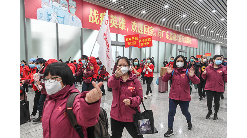 3月20日,在廣州南站,醫療隊隊員揮手致意。當日,廣東省支援湖北醫療隊的1087名隊員乘高鐵抵達廣州,平安返程。 (中新社記者 陳驥旻 攝)