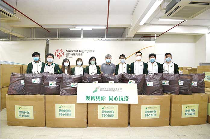 澳博早前於3月11日向澳門工會聯合總會、澳門街坊會聯合總會、澳門婦女聯合總會、澳門明愛、澳門特殊奧運會,以及澳門聽障人士協進會捐贈合計總值澳門幣一百五十萬元的「愛心生活包」,惠及三千個受疫情影響的弱勢家庭,當中包括單親家庭、長期病患者、獨居長者、殘障人士等。