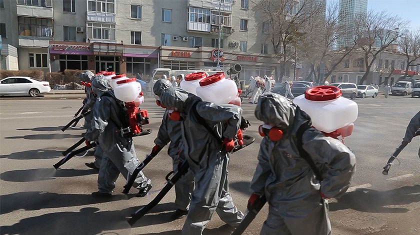 3月25日,在哈薩克斯坦努爾蘇丹,防疫人員在街頭開展消殺作業。為防止新冠肺炎疫情蔓延,哈薩克斯坦在全國多地開展消殺作業。 新華社發(努爾蘇丹市政府供圖)