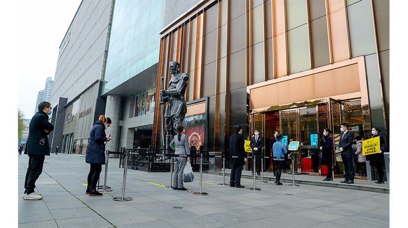 3月30日,顧客在武漢武商廣場外排隊等候進店。當日,武商、中商、漢商武漢三大商業集團旗下主要購物中心和楚河漢街等商業網點恢復營業。(中新社記者 張暢 攝)