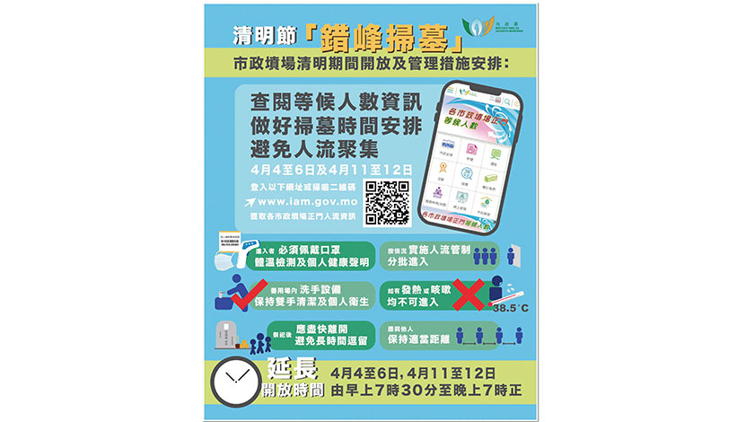 市政署轄下市政墳場於四月四日至六日、四月十一日至十二日延長開放時間,由早上七時三十分至晚上七時正開放,而為讓市民瞭解各市政墳場正門的人流情況,市政署於上述期間將透過網站http://www.iam.gov.mo向市民發佈相關資訊,屆時市民可登入上述網站或掃瞄有關二維碼(QRCode)進入查閱。此外,按過往情況,於清明節正日市民多集中於早上九時至下午三時期間前往掃墓,市政署建議市民應錯峰及參閱網站等候人數資料,以作更好掃墓安排,減低人流聚集的風險。