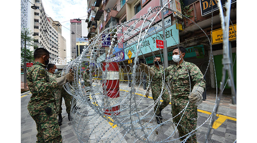 4月7日,在馬來西亞吉隆坡,士兵在一座因出現新冠肺炎病例而被封鎖的住宅樓前設置鐵絲網。馬來西亞衛生部7日通報,該國新增170例新冠肺炎確診病例,累計確診病例3963例,治愈1321例,死亡63例。新華社發(張紋綜攝)