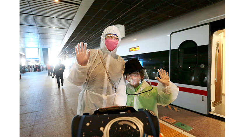 4月8日,一對母子『全副武裝』走出高鐵車廂。當日,武漢『解封』後,武漢始發的G857次動車組列車抵達西安北站。(中新社記者 張遠 攝)
