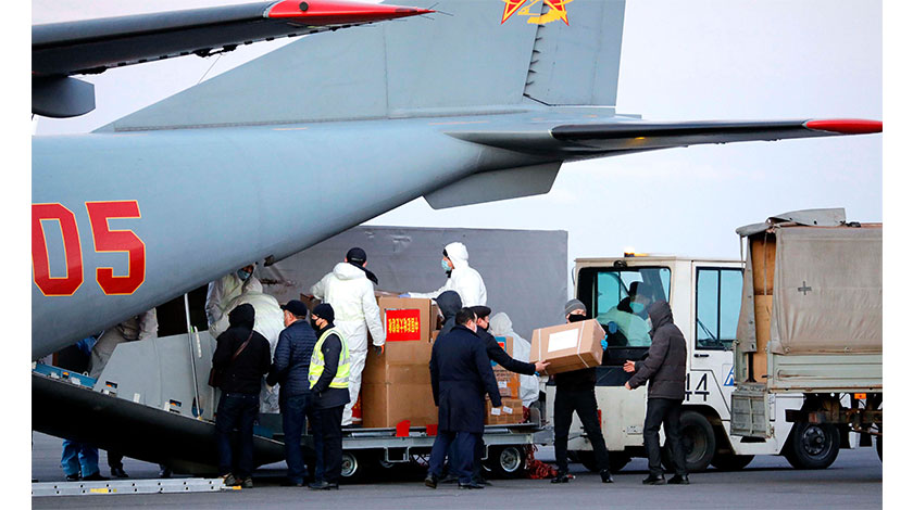 當地時間4月9日晚,應哈薩克斯坦政府邀請由中國政府派出的醫療專家組攜人道主義援助物資分乘哈方兩架軍機抵達哈首都努爾蘇丹。(中新社發 中國駐哈薩克斯坦大使館 供圖)