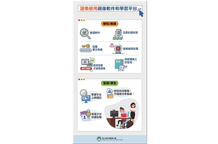 考慮到使用互聯網進行交流或學習可能涉及的個人資料保護問題,個資辦昨日發出“進行網上教學時保障學童個人資料的建議”,期望學校、家長以至學生本身,注意保護個人資料和私人生活,以免洩露學童私隱。相關建議簡介如下:
