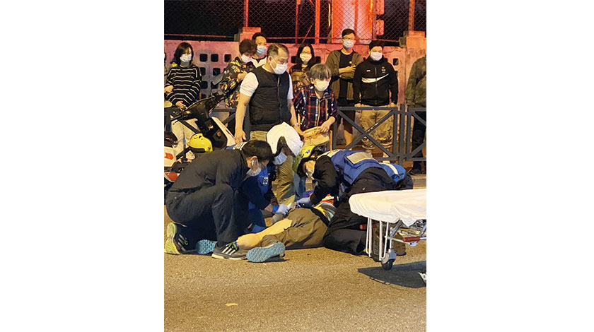 昨晚八時五十分,消防接報美副將大馬路近鮑思高巴士站發生交通意外有人受傷,救護員到場見一名婦人倒臥路中。經檢查女傷者左大腿裂傷,胸部挫傷及雙手擦傷,救護員立即替她護理傷勢,送往山頂醫院急救。