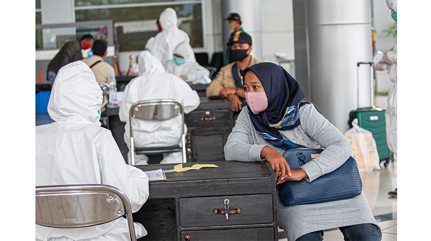 4月15日,在印度尼西亞帕盧,乘客抵達機場後登記信息。