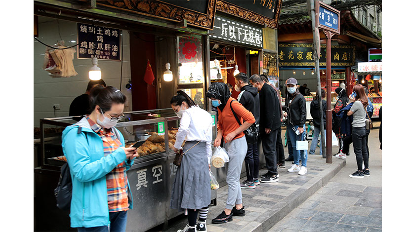 4月17日,民眾在陝西西安的回民街上排隊購買牛羊肉。(中新社記者 張遠 攝)