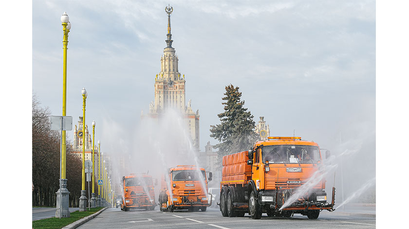 24日,在俄羅斯首都莫斯科,市政車輛進行消毒作業。 據俄羅斯防疫指揮部24日消息,在過去24小時俄新增新冠肺炎確診病例5849例,累計確診68622例。新華社發(葉甫蓋尼•西尼岑攝)