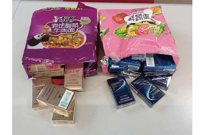 案件發生於本月22日,海關人員在關閘口岸截查一名多次不正常往返本澳的入境人士,當時其手持的膠袋內裝著兩大包即食麵,關員察覺其行色匆匆、神色有異,欲規避海關檢查,關員遂將其截停並以X光機掃描其手持的物品,結果發現即食麵包裝袋內藏有非即食麵的可疑物品,經打開包裝檢查,發現有人利用即食麵包裝袋作掩飾,將袋內即食麵全數更換為香煙,再用膠紙封口重新包裝,試圖蒙混過關,但終被海關關員查獲共1000支未完稅香煙。