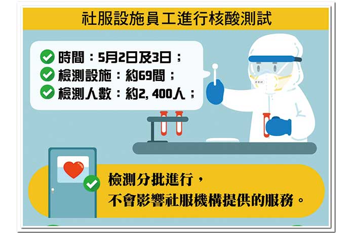 社工局研究及規劃廳廳長鄧潔芳則表示,為了配合特區政府的抗疫工作,經與衛生部門及社服機構商議,考慮院舍為密集場所,員工提供照護性質,將安排了五月二日及三日專為社服設施的員工進行核酸測試,預計涉及的設施近六十九間,受檢人數約二千四百人,相關的檢測會分批進行,並不影響社服機構的服務。羅奕龍補充,本澳目前有五萬多劑檢測試劑,檢測工作在軟、硬件,即試劑的數量、儀器、檢測人員的技術等上不斷隨著防疫工作而成熟,目前每日可以應付二千至二千五個檢測,局方亦對目前的檢測質量有信心,未來將會朝與第三方醫療機構合作,進行檢測工作,而重點檢測人群對象是動態發展,將會按情況作動態調整。
