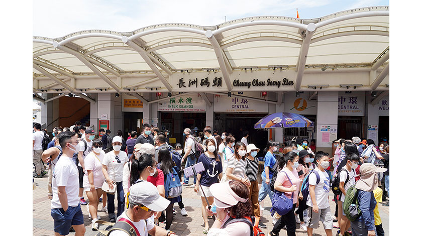 4月30日(農歷四月初八)是佛誕日,香港連續第五天無新增新冠肺炎確診病例,眾多市民來到長洲度假。大街上人頭攢動,紀念品店和魚蛋小食店顧客盈門,購買平安包的市民在多家餅店門口排起長龍。受新冠肺炎疫情影響,當天的長洲太平清醮活動安排從簡,包山嘉年華、飄色巡游、神功戲等活動取消,但保留了按照傳統習俗舉行的祭祀儀式。 圖為大批市民乘船抵達長洲碼頭。(香港中通社)
