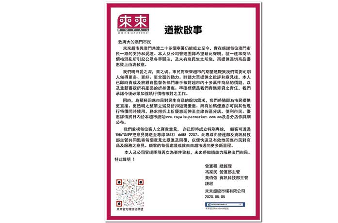【本報訊】來來超級市場遭消委會取消「誠信店」的資格後,昨日在官網發布道歉啟事,對連串商品價格混亂引起各界關注,及未有急民生之所急、適切提供商品優惠致上由衷歉意。