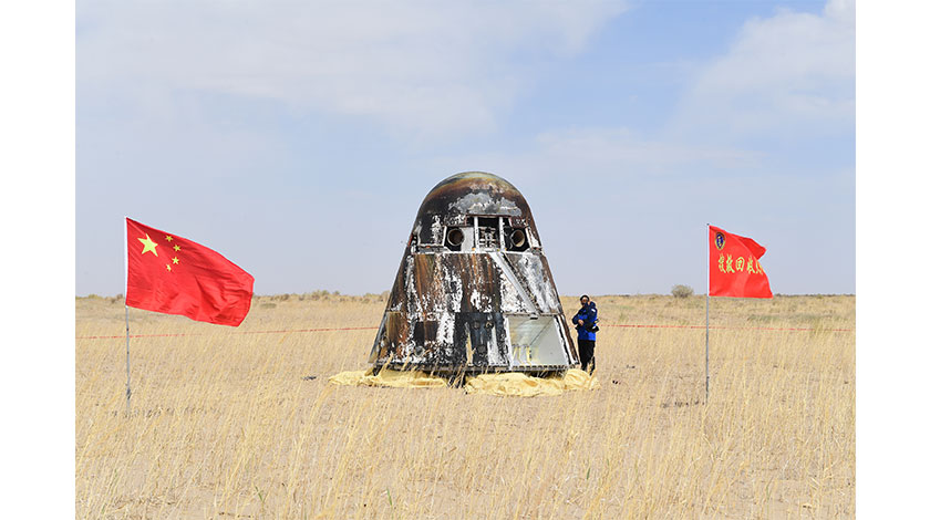 中國新一代載人飛船試驗船返回艙成功著陸 據中國載人航天工程辦公室消息,北京時間5月8日13時49分,中國新一代載人飛船試驗船返回艙在東風著陸場預定區域成功著陸,試驗取得圓滿成功。搜救分隊第一時間發現目標並到達著陸現場開展處置,經現場確認,艙體結構完好。圖為中國新一代載人飛船試驗船返回艙。(中新社發 汪江波 攝)