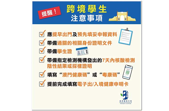 拱北海關提醒,為保障口岸通關安全有序,合資格的內地外僱通關前,須先向中資(澳門)職業介紹所協會進行資訊登記報備,確認已納入暫不實施集中隔離醫學觀察名單。如未納入名單,入境後將集中隔離醫學觀察十四天。有關的內地外僱須提前到珠澳兩地認可的具備資質的檢測機構核酸檢測。