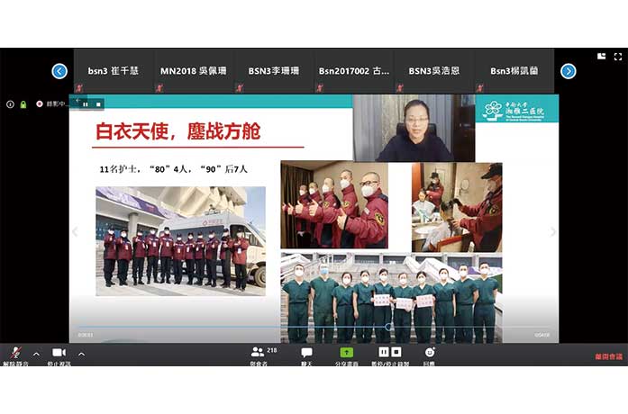 抗疫經驗分享專題講座由鏡湖護院教授朱明霞主持,邀請到該學院前任教師、現任湖南長沙中南大學湘雅二醫院護理部副主任張慧琳及鏡湖護院碩士在讀生詹海琪以錄製影片方式分享新冠肺炎前線抗疫情況,讓師生了解更多兩地抗疫工作,吸取寶貴經驗,增強專業認同感。