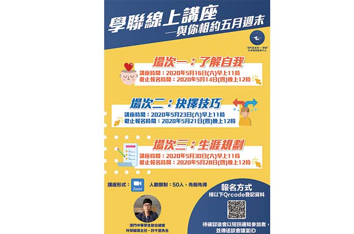 澳門學聯為幫助更多學生,每週末將繼續舉辦不同主題的線上講座,分別是「了解自我」、「抉擇技巧」、「生涯規劃」。歡迎對講座內容有興趣的人士,透過掃描二維碼報名,或是致電28723143查詢或預約。
