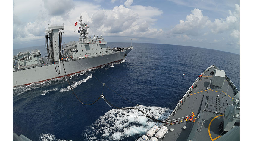 當地時間5月14日,印度洋某海域,中國海軍第35批護航編隊進行海上補給。當地時間5月14日至15日(東4區時間),海軍第35批護航編隊在印度洋某海域航渡期間開展編隊運動、艦機協同、伴隨護航、海上補給等針對性訓練,進一步檢驗編隊的協同能力。(中新社發 江山 攝)