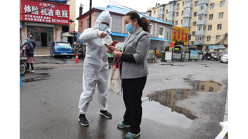 5月17日,吉林省吉林市,疫情防控人員為出行市民測溫。當前,吉林市積極加強疫情防控工作。(中新社記者 蒼雁 攝)