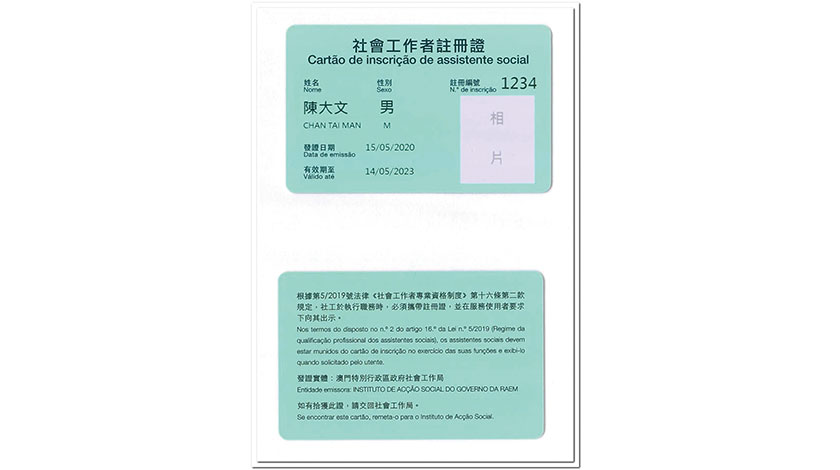 截至5月20日,共833人已通過專業資格認可,當中首輪有212人已獲批社工執業註冊。社工局會陸續上載註冊社工清單至網頁 https://www.infoswreg.ias.gov.mo/www/socialsearch ,以及安排領取專業資格認可證明書與社會工作者註冊證事宜,呼籲有關人士留意通知並盡快領證。根據法律規定,社工於執行職務時必須攜帶註冊證,且在服務使用者要求下向其出示。
