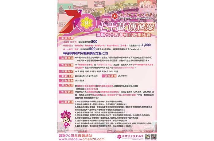 【特訊】今年是澳門婦女聯合總會成立七十周年,也是三八國際婦女節一百一十周年及《北京宣言暨行動綱領》二十五周年,婦聯總會舉辦「七十載 傳遞愛—婦聯七十周年相片徵集活動」,相片以「婦聯服務七十載」或「澳門婦女多貢獻」為主題,展示婦女在社會中發揮的積極作用和貢獻,以及加深市民對婦聯總會的認識。