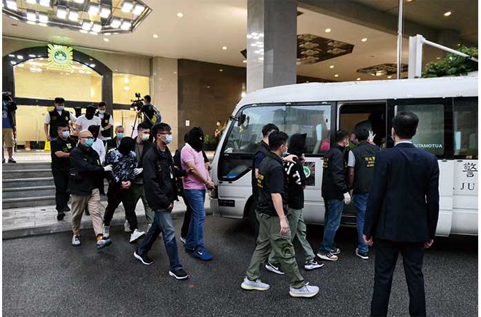 昨日凌晨二時,粵澳展開聯合行動,司警聯同海關於竹灣海灘發現蘇姓香港男主腦乘坐快艇登岸,乘坐一名姓郝男子所駕的士到氹仔某酒店,司警待兩人到酒店與一名姓麥男子接觸時將三人拘捕,在蘇的背包內搜出可卡因、冰毒、大麻花和開心粉。共值二百一十萬元。司警隨後在本澳不同地方再拘捕七名成員,搜出少量毒品和分拆包裝工具。