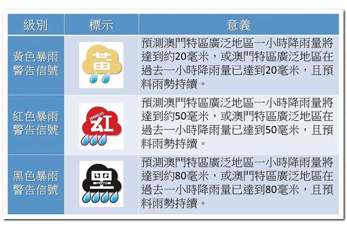 【特訊】新修訂的《暴雨警告信號系統》於2020年6月1日經由第17/2020號行政命令核准,並將於9月1日起正式生效。新的《暴雨警告信號系統》分為三個級別,以反映不同強度的暴雨所帶來的風險和影響,讓社會上不同群體因應自身的條件和需求,採取適當的應變措施。此外,是次修改亦同時對《雷暴警告信號》的安全提示進行優化。