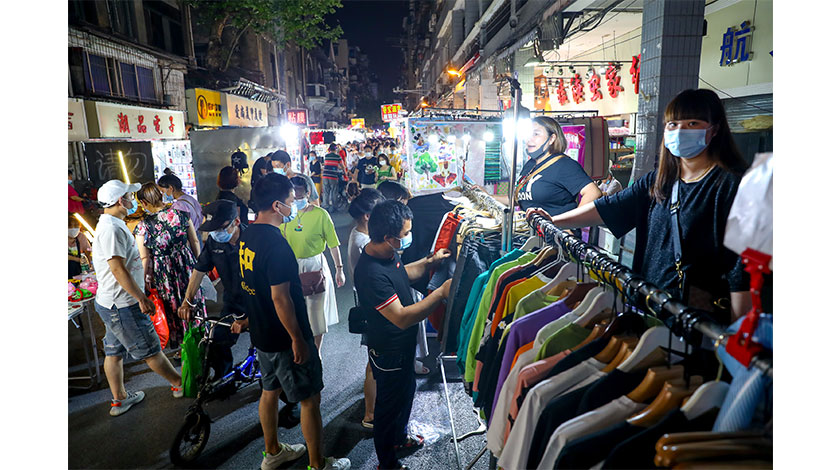 6月3日,市民在武漢保成路夜市消費休閑。隨著復工復產復市持續推進,武漢傳統的街頭夜市熱鬧起來,不少市民前來消費休閑。(中新社記者 張暢 攝)