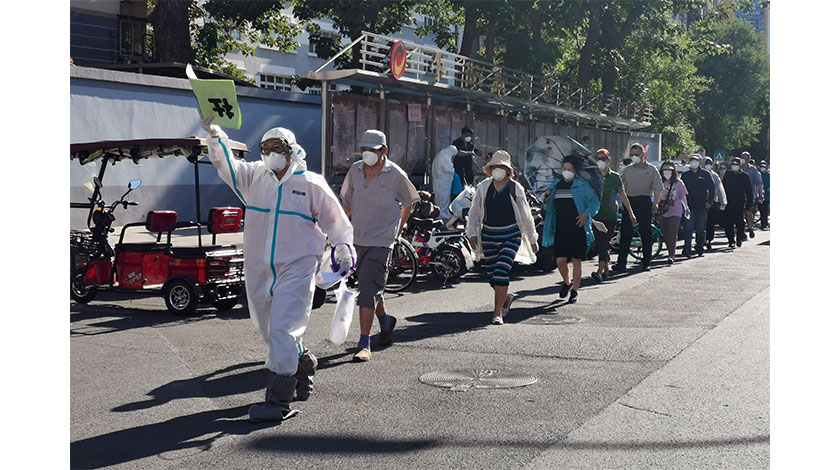 6月14日,北京市民在宣武體育場進行核酸採樣。當日下午,北京市政府召開疫情防控第116場例行新聞發佈會,介紹有關情況。北京市疾病預防控制中心副主任龐星火介紹,6月14日0時至7時,北京市新增新冠肺炎確診病例8例,與新發地市場有關聯,其中1例確診病例信息正在流調中。(中新社記者 杜洋 攝)