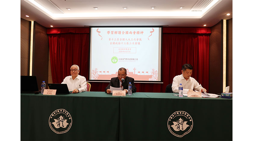 何敬麟報告十三屆全國人大會議情況,並提到賀定一委員在政協會議上的視頻發言,一國兩制在澳門成功實踐,當中包括向全國人民展現澳門己全面做到在大、中、小學懸掛國旗和高唱國歌,這視頻在短短時間內已達到1.6億的點擊率,這是值得澳門人自豪的事情。他還分享了北京的防疫抗疫措施,提到關鍵詞六穩和六保,在2018年7月,中美貿易摩擦加劇,外部環境發生明顯變化,經濟運行穩中有變,穩中有憂,中央審時度勢,未雨綢繆,旗幟鮮明提出“要做好穩就業、穩金融、穩外貿、穩外資、穩投資、穩預期工作”,把“六穩”作為實現中國經濟穩中求進的基本要求。六保即保居民就業、保基本民生、保市場主體、保糧食能源安全、保產業鏈供應鏈穩定、保基層運轉。其後著重發表對“港區國安法”的看法,認為高票數通過“港區國安法”的立法和授權人大常委會執行,為全國人民的共同決定,維護國家安全人人有責。最後分享李克強總理的工作報告最後一段作為總結,中華民族是向來不畏艱難險阻,當代中國人是有戰勝任何挑戰的堅定意志和能力。
