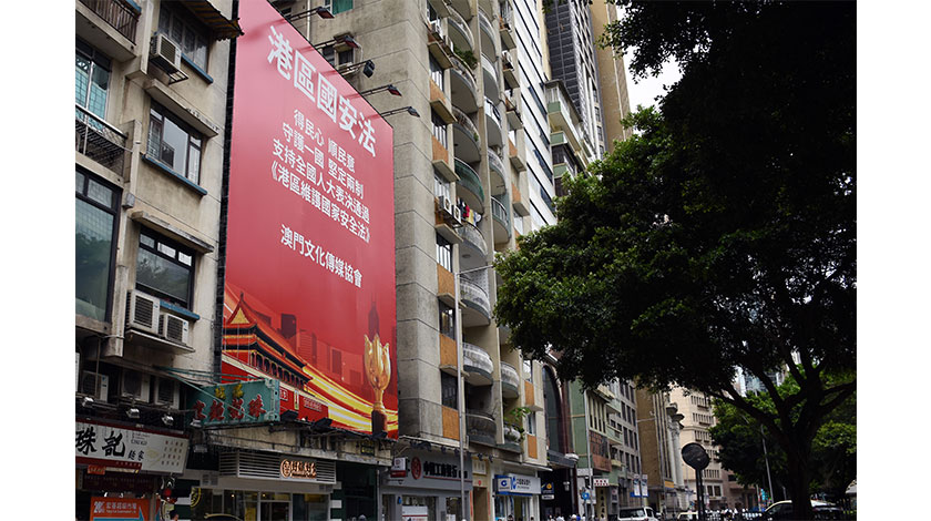 該將大廈外牆一樓以上全覆蓋的「澳門文化傳媒協會支持全國人大表決通過《港區維護國家安全法》」的巨型紅色廣告一出已惹起關注,不過廣告於上週六已被拆下,現只留有廣告支架。