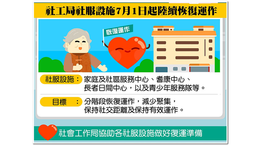 基於各類別社會服務設施的性質、特性和服務對象的不同,將會以分階段恢復運作,以達至減低聚集、保持社交距離,以及能有效運作為目標。服務使用者及其家屬可直接向相關中心了解恢復運作的日程及具體安排。