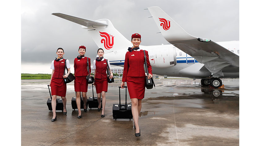 6月28日,中國航空集團有限公司、中國東方航空集團有限公司、中國南方航空集團有限公司在中國商飛總裝製造中心浦東基地正式接收各自首架國產ARJ21飛機。3架飛機同時交付,標誌著中國國產ARJ21飛機正式入編國際主流航空公司機隊。此次交付給國航、東航、南航的三架ARJ21飛機均採用90座全經濟艙佈局。圖為國航乘務員在國航首架ARJ21客機前合影留念。(中新社記者 殷立勤 攝)