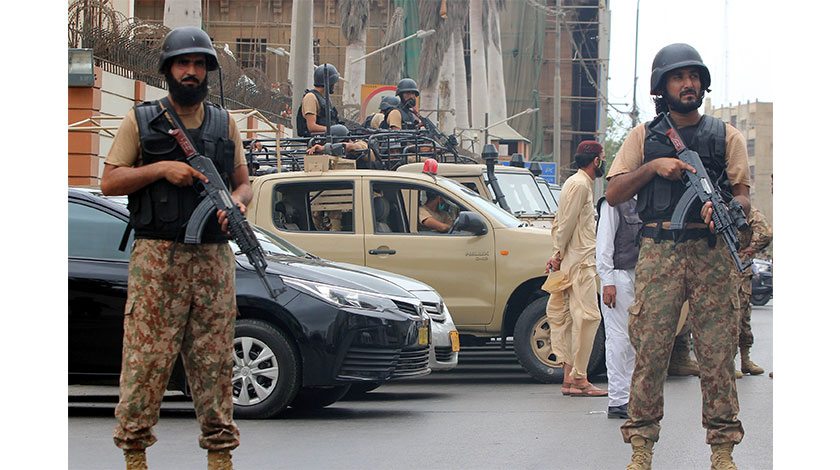 29日,安全人員封鎖巴基斯坦卡拉奇的襲擊現場附近區域。巴基斯坦警方29日證實,4名武裝人員當天襲擊位於巴南部城市卡拉奇的巴基斯坦證券交易所大樓,導致至少5人死亡、6人受傷。4名武裝人員被擊斃。『俾路支解放軍』宣稱實施此次襲擊。巴基斯坦官方尚未就此襲擊事件發表聲明。(新華社發)