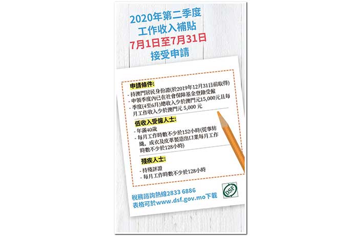 【特訊】2020年第二季工作收入補貼將於7月1日至7月31日接受申請,本年度申請對象放寬至澳門非永久居民。凡年滿四十歲、於申領補貼季度內已在社會保障基金登錄為受僱人士,以及持澳門特別行政區居民身份證(須於2019年12月31日或以前取得),只要每月工作不少於152小時,或從事紡織、成衣及皮革產品製造出口業每月工作不少於128小時,且該季度工作收入少於澳門元15000元及每月工作收入少於澳門元5000元,均可申請工作收入補貼。