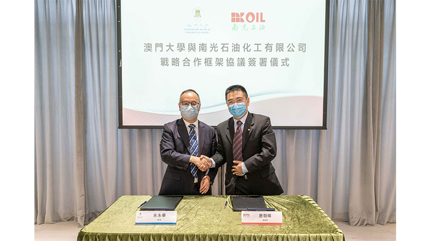 《澳門大學與南光石油化工有限公司戰略合作框架協議》由澳大校長宋永華及南光石油總經理唐朝暉共同簽署。其他出席協議簽署儀式的嘉賓包括:南光集團副總經理王彤彥、澳大副校長葛偉、澳大研究服務及知識轉移辦公室主任楊志新、南光石油常務副總經理劉鍵生、澳大智慧城市物聯網國家重點實驗室教授及科技學院電機及電腦工程系主任黃民聰及南光集團企業管理部助理總經理張海軍。