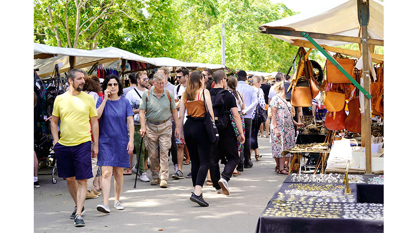 7月5日,因疫情關閉近4個月的柏林牆公園跳蚤市場重開。日前,柏林已重新允許電影院線營業,而頗受遊客和本地人歡迎的這一市集重開被認為是當地生活重回常態的又一標誌。人們進入跳蚤市場需要排隊限流,並且保持1.5米人際距離。(中新社記者 彭大偉 攝)