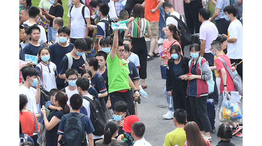 7月8日,重慶育才中學考點,考生結束考試後在人群中雀躍歡呼。當日是2020年全國高考的第二天。(中新社記者 陳超 攝)