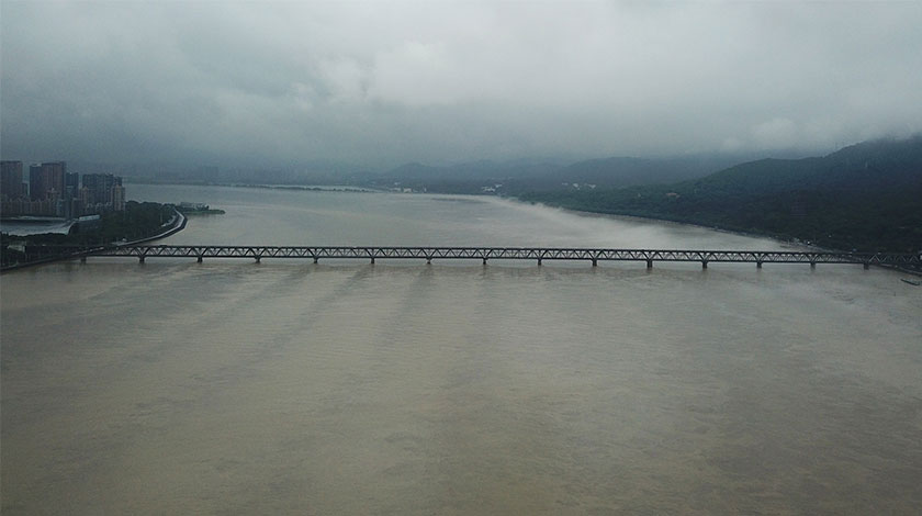 7月8日,受浙江建德新安江水庫洩洪及流域性洪水影響,錢塘江杭州段洪水湧流,水位上漲。(中新社記者 王剛 攝)