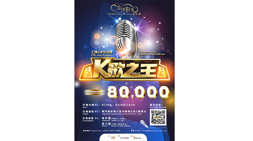 【特訊】金沙中國將於8月7-9日在金光會展舉行的「金沙物美嘉年華」同場舉辦「工銀e支付呈獻:K歌之王歌唱比賽」,參賽者將有機會贏取價值近澳門幣80000元的豐富獎金獎品。歌唱比賽將於7月13日至27日下午6時期間接受報名。