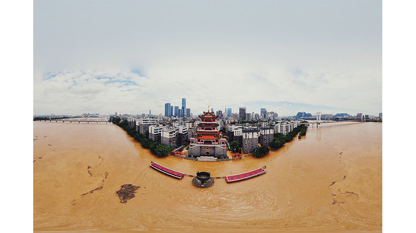 7月12日,航拍柳江柳州市區段。廣西柳江柳州市區段年內第4次超警戒水位,當日7時50分,柳江柳州水文站出現83.80米的洪峰水位,超警戒水位1.3米。(中新社記者 王以照 攝)