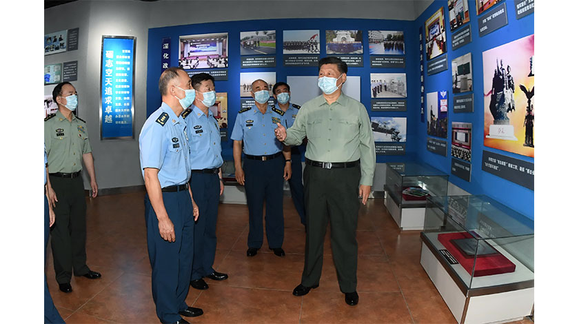 八一建軍節到來之際,中共中央總書記、國家主席、中央軍委主席習近平7月23日到空軍航空大學視察,代表黨中央和中央軍委,向學校師生員工致以誠摯問候,向全體人民解放軍指戰員、武警部隊官兵、民兵預備役人員致以節日祝賀。這是習近平參觀學校航空館。(新華社記者 李剛 攝)
